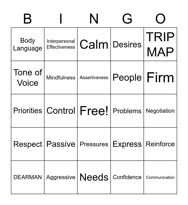 This bingo card has a free space and 24 words: Passive, Aggressive, Assertiveness, DEARMAN, TRIP MAP, Body Language, Tone of Voice, Interpersonal Effectiveness, Problems, Pressures, People, Priorities, Express, Reinforce, Mindfulness, Confidence, Negotiation, Calm, Firm, Control, Communication, Respect, Desires and Needs.