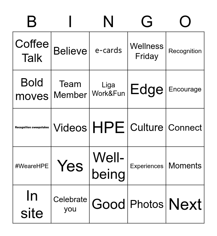 This bingo card has 2 images, a free space and 47 words: Appreacition, Next, Bold, Good, Yes, Demostrate, Believe, Accelerating, Bold moves, We can, Team Member, Wellness Friday, Moments, Experiences, Memories, ERG, Liga Work&Fun, Culture, StarPoint, Recognition, Videos, Photos, Coffee Talk, Edge, Virtual, Encourage, In site, Virtual, Well-being, #WeareHPE, Thank you, Contribute, Every day, Feel appreciated, Celebrate you, Win, Recognize, Journey, Connect, Have fun, Colleagues, Because you matter, Team experiences, Points, Grow, Colombia and Gracias.