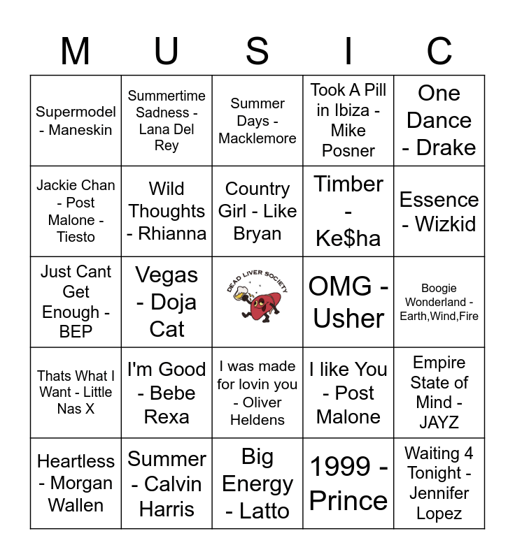 This bingo card has a free space and 30 words: Summer - Calvin Harris, Closer - Chainsmokers, Vegas - Doja Cat, One Kiss - Dua Lipa, Supermodel - Maneskin, Summer Days - Macklemore, Wild Thoughts - Rhianna, I was made for lovin you - Oliver Heldens, OMG - Usher, Big Energy - Latto, Boogie Wonderland - Earth,Wind,Fire, Waiting 4 Tonight - Jennifer Lopez, 1999 - Prince, What's Love Got To Do With it - Tina Turner, Essence - Wizkid, First Class - Jack Harlow, I like You - Post Malone, Thats What I Want - Little Nas X, I'm Good - Bebe Rexa, One Dance - Drake, Just Cant Get Enough - BEP, Cool For the Summer - Demi Lovato, Summertime Sadness - Lana Del Rey, Timber - Ke$ha, Jackie Chan - Post Malone - Tiesto, Took A Pill in Ibiza - Mike Posner, Empire State of Mind - JAYZ, Heartless - Morgan Wallen, Country Girl - Like Bryan and Young Wild and Free - Snoop, Bruno Mars.