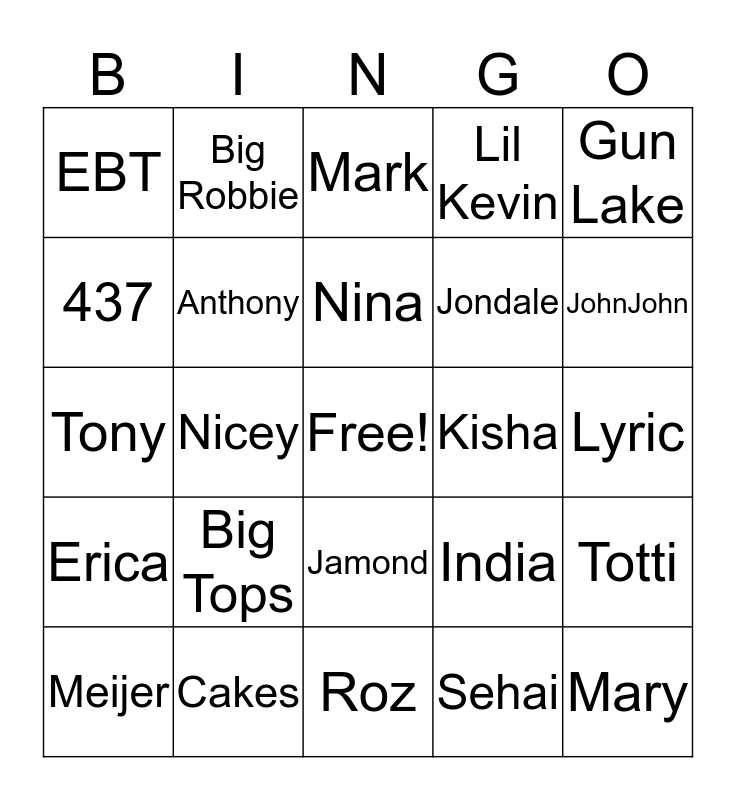 This bingo card has a free space and 24 words: Big Tops, Cakes, Nina, Meijer, Gun Lake, EBT, 437, Big Robbie, Kisha, Jamond, Jondale, Tony, India, Totti, Anthony, Sehai, Lyric, Mark, JohnJohn, Nicey, Mary, Erica, Lil Kevin and Roz.