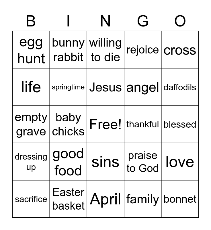 This bingo card has a free space and 24 words: good food, Easter basket, Jesus, sacrifice, cross, egg hunt, life, bunny rabbit, thankful, sins, angel, empty grave, praise to God, love, springtime, family, blessed, willing to die, daffodils, baby chicks, bonnet, dressing up, rejoice and April.