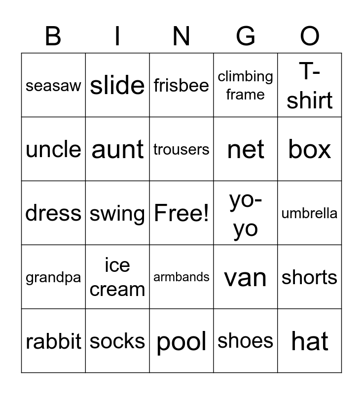 This bingo card has a free space and 31 words: pool, tracksuit, swing, coat, seasaw, frisbee, aunt, van, yo-yo, shoes, umbrella, hat, queen, cousin, box, grandma, shorts, ice cream, grandpa, armbands, T-shirt, cardigan, rabbit, slide, net, uncle, climbing frame, dress, socks, trousers and zebra.