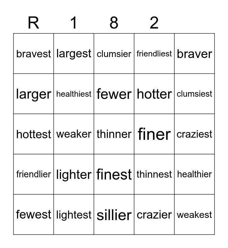 This bingo card has a free space and 24 words: lighter, lightest, fewer, fewest, braver, bravest, larger, largest, finer, finest, hotter, hottest, thinnest, healthier, healthiest, crazier, craziest, clumsier, clumsiest, weaker, weakest, friendlier, friendliest and sillier.