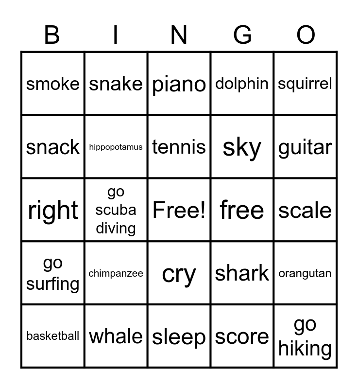 This bingo card has a free space and 24 words: chimpanzee, whale, tennis, basketball, squirrel, smoke, snack, snake, free, cry, sky, right, shark, orangutan, hippopotamus, score, scale, piano, guitar, go scuba diving, go hiking, go surfing, dolphin and sleep.