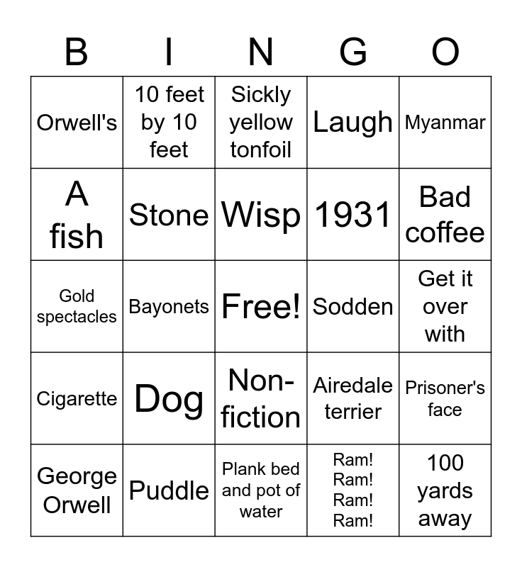 This bingo card has a free space and 24 words: Dog, Puddle, Wisp, George Orwell, Myanmar, Orwell's, A fish, 10 feet by 10 feet, Sodden, Non-fiction, 1931, Gold spectacles, Airedale terrier, Prisoner's face, Stone, Ram! Ram! Ram! Ram!, Get it over with, Sickly yellow tonfoil, Bad coffee, Bayonets, 100 yards away, Cigarette, Laugh and Plank bed and pot of water.