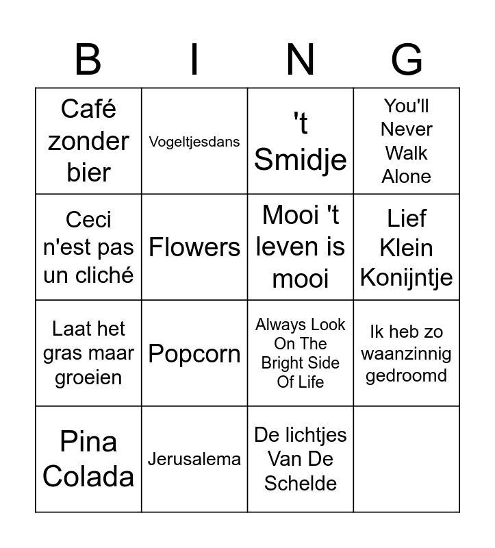 This bingo card has 16 words: Free!, Pina Colada, Vogeltjesdans, 't Smidje, Lief Klein Konijntje, Café zonder bier, Popcorn, Always Look On The Bright Side Of Life, You'll Never Walk Alone, Ceci n'est pas un cliché, Jerusalema, Mooi 't leven is mooi, Ik heb zo waanzinnig gedroomd, Laat het gras maar groeien, Flowers and De lichtjes Van De Schelde.