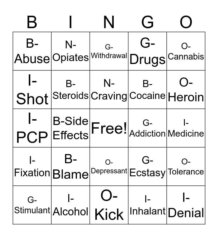 This bingo card has a free space and 24 words: B-Blame, I-Alcohol, N-Craving, G-Stimulant, O-Cannabis, B-Abuse, I-Shot, N-Opiates, G-Addiction, O-Depressant, B-Cocaine, I-PCP, G-Ecstasy, O-Tolerance, B-Steroids, I-Inhalant, I-Medicine, G-Withdrawal, O-Heroin, B-Side Effects, I-Denial, I-Fixation, G-Drugs and O-Kick.