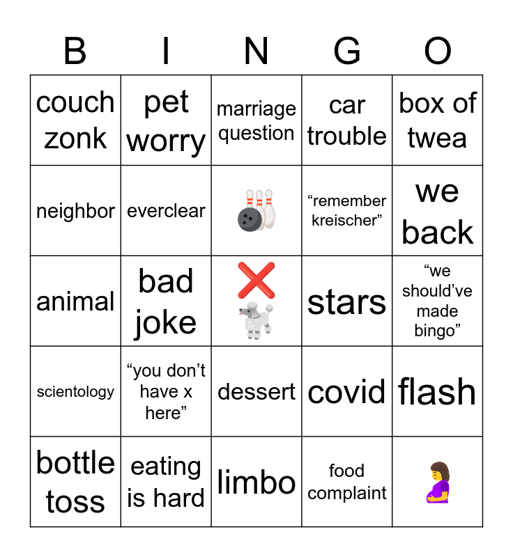 This bingo card has a free space and 24 words: “you don’t have x here”, eating is hard, 🎳, bottle toss, box of twea, couch zonk, neighbor, pet worry, stars, dessert, “remember kreischer”, animal, covid, flash, everclear, food complaint, “we should’ve made bingo”, marriage question, we back, bad joke, 🤰, scientology, car trouble and limbo.