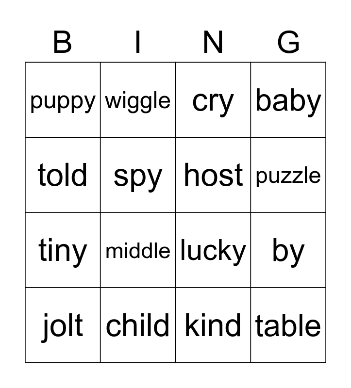 This bingo card has 16 words: child, by, cry, puppy, tiny, wiggle, lucky, kind, told, spy, jolt, baby, middle, puzzle, host and table.
