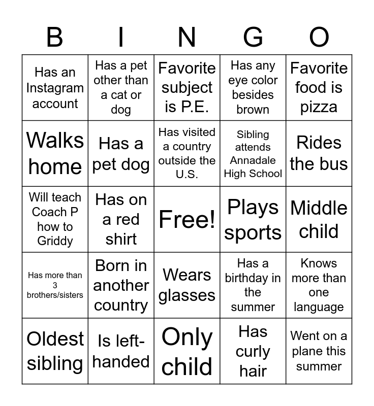 This bingo card has a free space and 25 words: Born in another country, Only child, Has visited a country outside the U.S., Oldest sibling, Favorite food is pizza, Has an Instagram account, Walks home, Has a pet other than a cat or dog, Plays sports, Wears glasses, Sibling attends Annadale High School, Will teach Coach P how to Griddy, Has a birthday in the summer, Knows more than one language, Has a pet dog, Has a pet cat, Middle child, Favorite subject is P.E., Rides the bus, Has on a red shirt, Went on a plane this summer, Is left-handed, Has more than 3 brothers/sisters, Has any eye color besides brown and Has curly hair.
