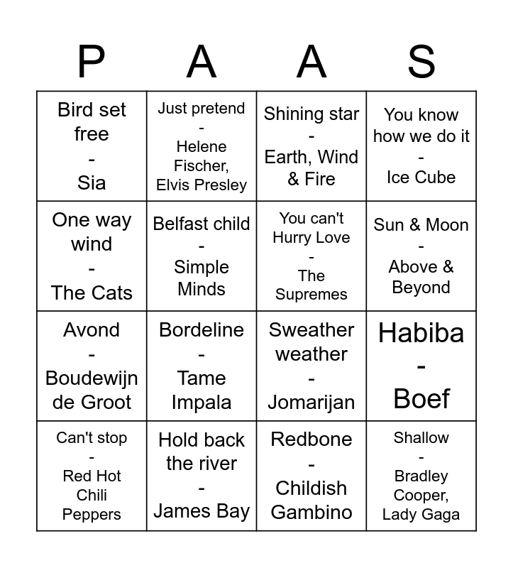 This bingo card has 16 words: Can't stop - Red Hot Chili Peppers, Hold back the river - James Bay, Shining star - Earth, Wind & Fire, You know how we do it - Ice Cube, One way wind - The Cats, Just pretend - Helene Fischer, Elvis Presley, Sweather weather - Jomarijan, Habiba - Boef, Bird set free - Sia, Belfast child - Simple Minds, Redbone - Childish Gambino, Sun & Moon - Above & Beyond, Avond - Boudewijn de Groot, Bordeline - Tame Impala, You can't Hurry Love - The Supremes and Shallow - Bradley Cooper, Lady Gaga.
