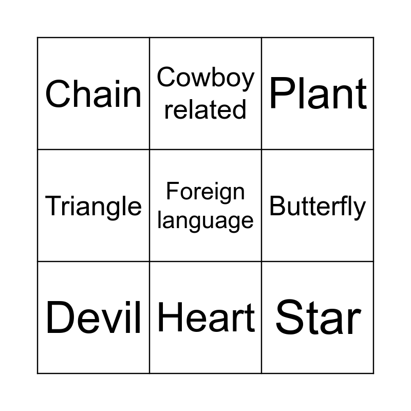 This bingo card has 11 words: Star, Heart, Foreign language, Devil, Cowboy related, Plant, Butterfly, A single letter, Triangle, Chain and Snake.