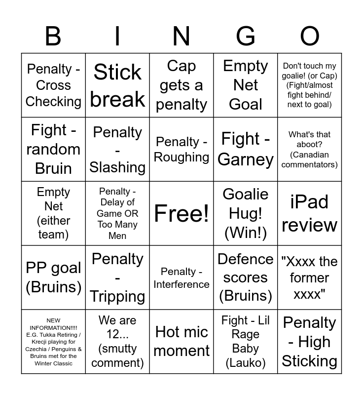 This bingo card has a free space and 28 words: "Xxxx the former xxxx", Fight - Baby Rage Baby (Freddy), Fight - Garney, Fight - Lil Rage Baby (Lauko), Fight - random Bruin, Cap gets a penalty, Stick break, PP goal (Bruins), Goalie Hug! (Win!), NEW INFORMATION!!!! E.G. Tukka Retiring / Krecji playing for Czechia / Penguins & Bruins met for the Winter Classic, Empty Net (either team), Empty Net Goal, We are 12... (smutty comment), Hot mic moment, What's that aboot? (Canadian commentators), Penalty - Hooking, Penalty - Tripping, Penalty - Slashing, Penalty - Roughing, Penalty - Interference, Penalty - Cross Checking, Penalty - Holding, Penalty - High Sticking, Penalty - Delay of Game OR Too Many Men, iPad review, Defence scores (Bruins), Don't touch my goalie! (or Cap) (Fight/almost fight behind/ next to goal) and Breakaway that leads to a goal.