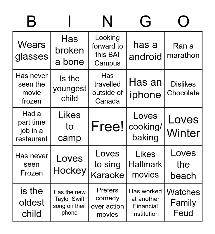 This bingo card has a free space and 24 words: Loves Hockey, Has the new Taylor Swift song on their phone, Has travelled outside of Canada, is the oldest child, Ran a marathon, Wears glasses, Has never seen the movie frozen, Has broken a bone, Loves cooking/ baking, Loves to sing Karaoke, Has an iphone, Had a part time job in a restaurant, Likes Hallmark movies, Loves the beach, Is the youngest child, Has worked at another Financial Institution, Loves Winter, Looking forward to this BAI Campus, Dislikes Chocolate, Likes to camp, Watches Family Feud, Has never seen Frozen, has a android and Prefers comedy over action movies.