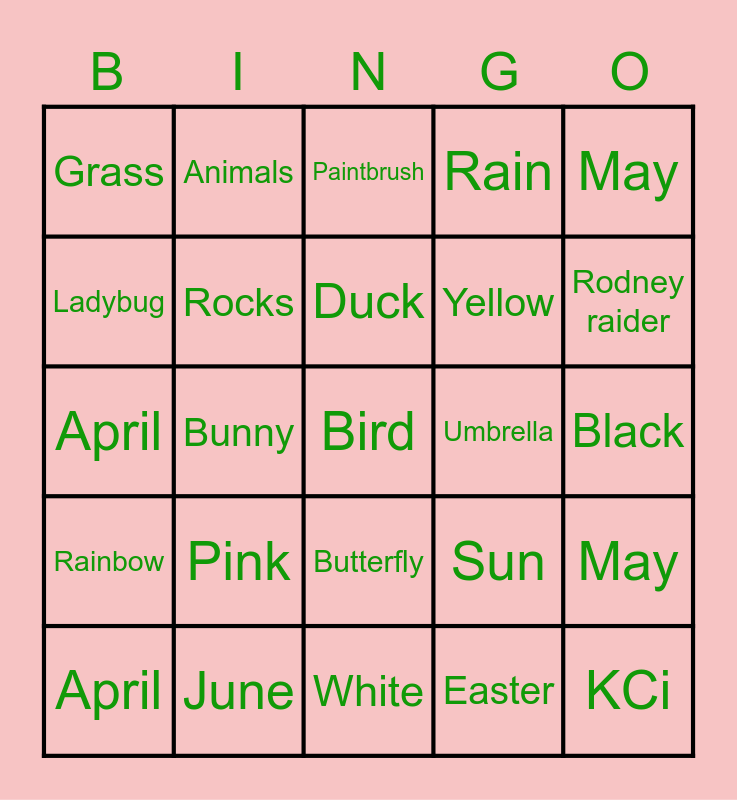 This bingo card has 35 words: Trees, Bumble Bee, Painting, Rocks, Butterfly, Rain, Ladybug, Flowers, Duck, Frog, April, May, June, Puddles, Grass, Umbrella, Easter, Bunny, Rainbow, Bird, Sun, April, May, June, Paintbrush, Rodney raider, KCi, Red, Yellow, Black, Green, White, Pink, Animals and hibernation.