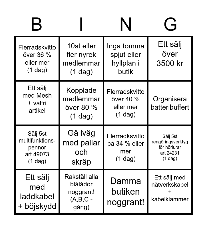 This bingo card has 16 words: Rakställ alla blålådor noggrant! (A,B,C - gång), Sälj 5st rengöringsverktyg för hörlurar art 24231 (1 dag), Inga tomma spjut eller hyllplan i butik, Flerradskvitto över 36 % eller mer (1 dag), Sälj 5st multifunktions- pennor art 49073 (1 dag), 10st eller fler nyrek medlemmar (1 dag), Flerradksvitto på 34 % eller mer (1 dag), Damma butiken noggrant!, Ett sälj med Mesh + valfri artikel, Kopplade medlemmar över 80 % (1 dag), Ett sälj med laddkabel + böjskydd, Ett sälj över 3500 kr, Gå iväg med pallar och skräp, Organisera batteribuffert, Flerradskvitto över 40 % eller mer (1 dag) and Ett sälj med nätverkskabel + kabelklammer.