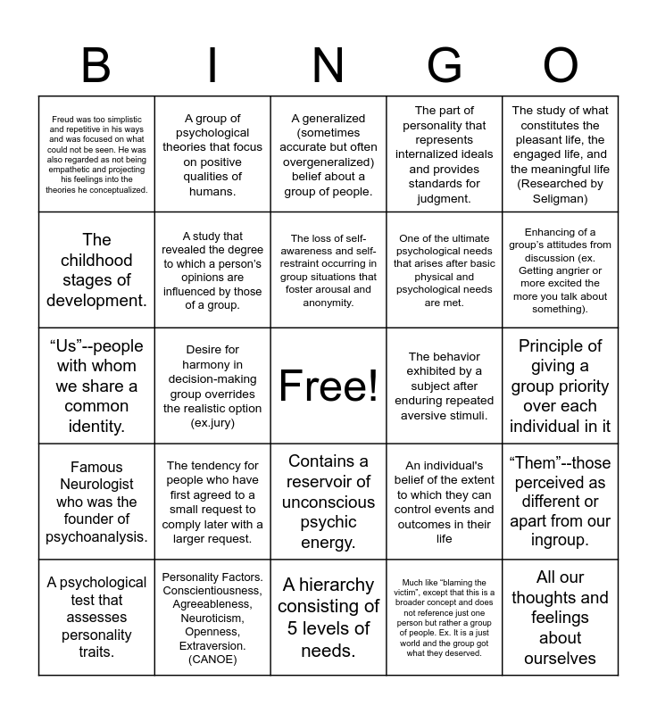 This bingo card has a free space and 54 words: Freud’s theory of personality that attributes thoughts and actions to unconscious motives and conflicts., Famous Neurologist who was the founder of psychoanalysis., A reservoir of mostly unacceptable thoughts, wishes, feelings and memories., Position before consciousness (not currently aware of but could be brought into consciousness at any given moment)., Contains a reservoir of unconscious psychic energy., The largely conscious, “executive” part of personality., The part of personality that represents internalized ideals and provides standards for judgment., The ego’s protective methods of reducing anxiety., The childhood stages of development., A personality test, such as the Rorschach or TAT., Freud was too simplistic and repetitive in his ways and was focused on what could not be seen. He was also regarded as not being empathetic and projecting his feelings into the theories he conceptualized., A characteristic pattern of behavior., Personality Factors. Conscientiousness, Agreeableness, Neuroticism, Openness, Extraversion. (CANOE), A psychological test that assesses personality traits., Reters to the controversy concerning whether the person or the situation is more influential in determining a person's behavior, A hierarchy consisting of 5 levels of needs., All our thoughts and feelings about ourselves, One of the ultimate psychological needs that arises after basic physical and psychological needs are met., A social and political ideology that places a high value on the individual., Principle of giving a group priority over each individual in it, An individual's belief of the extent to which they can control events and outcomes in their life, The theory set forth by psychologist Albert Bandura which states that a person's behavior both influences and is influenced by personal factors and the social environment., The behavior exhibited by a subject after enduring repeated aversive stimuli., The study of what constitutes the pleasant life, the engaged life, and the meaningful life (Researched by Seligman), Way in which people process, remember, and use information in social contexts to explain/predict their own/others behavior., A group of psychological theories that focus on positive qualities of humans., The tendency for observers, when analyzing another’s behavior, to underestimate the impact of the situation and to overestimate the impact of personal disposition., Feelings, often influenced by our beliefs, that predispose us to respond in a particular way to objects, people, and events., Mental processes that we use to form impressions of other people, Much like “blaming the victim”, except that this is a broader concept and does not reference just one person but rather a group of people. Ex. It is a just world and the group got what they deserved., Claim success is from our own efforts and our failures aren’t our faults but due to outside forces beyond our control., Tendency to attribute one’s own behavior to outside influences and give yourself the pass., The theory that we act to reduce the discomfort we feel when two of our thoughts are inconsistent. For example, when our awareness of our attitudes and of our actions clash, we can reduce the results dissonance by changing our attitudes., Preconceived judgment, opinion or attitude directed toward certain people based on their membership in a particular group., A generalized (sometimes accurate but often overgeneralized) belief about a group of people., Unjustifiable negative behavior toward a group and its members., “Us”--people with whom we share a common identity., “Them”--those perceived as different or apart from our ingroup., A study that looks at what causes groups to change their behavior when they come into contact with each other., A study that revealed the degree to which a person’s opinions are influenced by those of a group., A study that explored the willingness of individuals to follow the orders of authorities when those orders conflict with the individual’s moral judgment (obedience)., A study that focussed on the diffusion of responsibility (Bystander effect)., Less likely to give help when there are more people around because everyone thinks someone else will help., When a person is less likely to take responsibility for action when other bystanders or witnesses are present., The tendency for people who have first agreed to a small request to comply later with a larger request., Influence resulting from a person’s desire to gain approval or avoid disapproval., Influence resulting from one’s willingness to accept others’ opinions about reality., The tendency for people in a group to exert less effort when pooling their efforts toward attaining a common goal than when individually accountable., The loss of self-awareness and self-restraint occurring in group situations that foster arousal and anonymity., Desire for harmony in decision-making group overrides the realistic option (ex.jury), Enhancing of a group’s attitudes from discussion (ex. Getting angrier or more excited the more you talk about something)., The phenomenon that repeated exposure to novel stimuli increases liking of them., Unselfish regard for the welfare of others. and The theory that our social behavior is an exchange process, the aim of which is to maximize benefits and minimize costs..