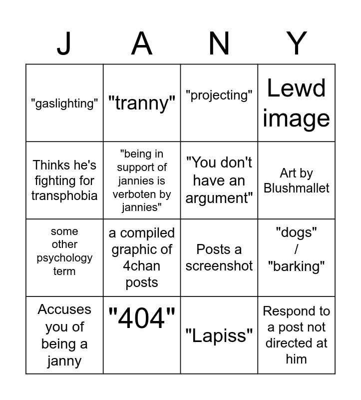 This bingo card has 16 words: "404", "dogs" / "barking", "projecting", "gaslighting", some other psychology term, "tranny", Posts a screenshot, "Lapiss", Thinks he's fighting for transphobia, "being in support of jannies is verboten by jannies", Accuses you of being a janny, Lewd image, a compiled graphic of 4chan posts, Art by Blushmallet, "You don't have an argument" and Respond to a post not directed at him.