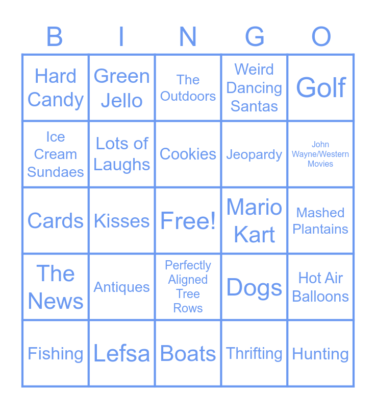 This bingo card has a free space and 24 words: Antiques, Lefsa, Cookies, Fishing, Golf, Hard Candy, Ice Cream Sundaes, Green Jello, Mario Kart, Perfectly Aligned Tree Rows, Jeopardy, Cards, Dogs, Hot Air Balloons, Lots of Laughs, Thrifting, Mashed Plantains, The Outdoors, John Wayne/Western Movies, Kisses, Hunting, The News, Weird Dancing Santas and Boats.