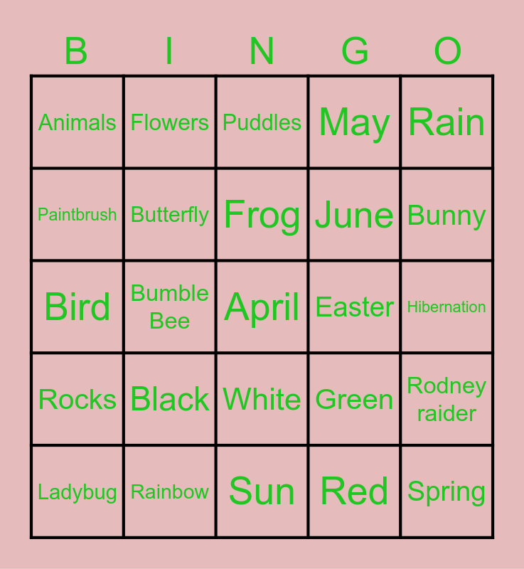 This bingo card has 33 words: Spring, Trees, Bumble Bee, Painting, Rocks, Butterfly, Rain, Ladybug, Flowers, Duck, Frog, Puddles, Grass, Umbrella, Easter, Bunny, Rainbow, Bird, Black, Green, White, Pink, Animals, Hibernation, Sun, April, May, June, Paintbrush, Rodney raider, KCI, Red and Yellow.