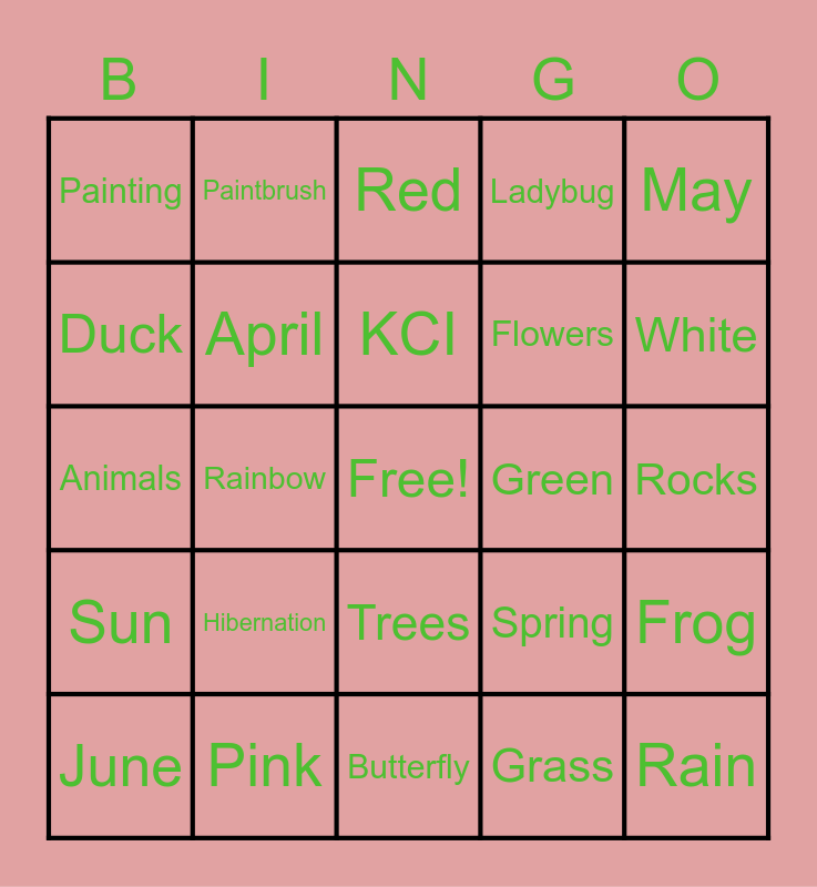 This bingo card has a free space and 33 words: Easter, Bunny, Rainbow, Bird, Sun, April, May, June, Paintbrush, Rodney raider, KCI, Red, Yellow, Black, Green, White, Pink, Animals, Hibernation, Spring, Trees, Bumble Bee, Painting, Rocks, Butterfly, Rain, Ladybug, Flowers, Duck, Frog, Puddles, Grass and Umbrella.