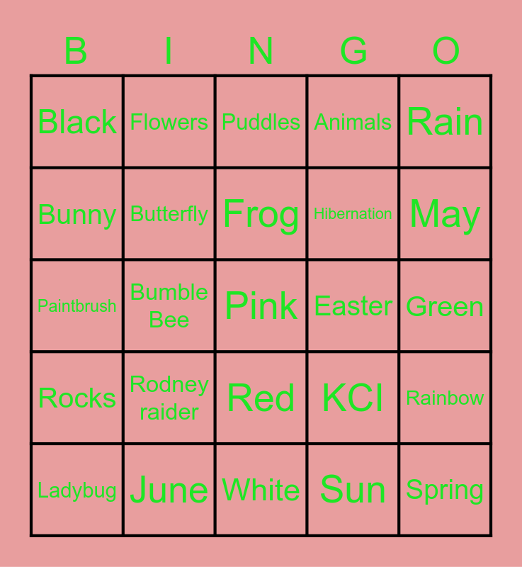 This bingo card has 33 words: Spring, Trees, Bumble Bee, Painting, Rocks, Butterfly, Rain, Ladybug, Flowers, Duck, Frog, Puddles, Grass, Umbrella, Easter, May, June, Paintbrush, Rodney raider, KCI, Red, Yellow, Black, Green, White, Pink, Animals, Hibernation, Bunny, Rainbow, Bird, Sun and April.