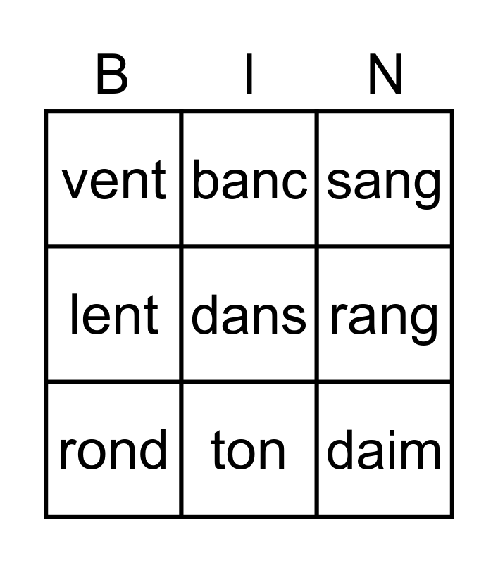 This bingo card has 16 words: pain, bain, sang, vent, daim, banc, rein, lin, dans, rang, sein, lent, son, ton, rond and long.