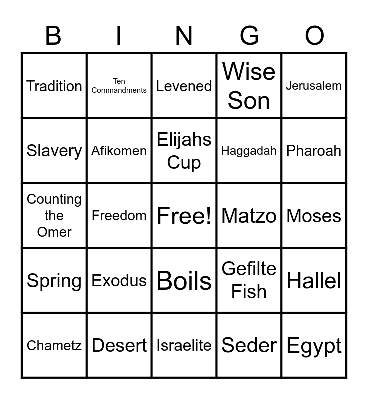 This bingo card has a free space and 29 words: Chametz, Wine, Freedom, Salt Water, Tradition, Levened, Afikomen, Exodus, Matzo, Desert, Moses, Egypt, Israelite, Seder, Pharoah, 4 Questions, Boils, Spring, Jerusalem, Counting the Omer, Gefilte Fish, Nile River, Haggadah, Slavery, Wise Son, Ten Commandments, Hallel, Elijahs Cup and Splitting Sea.