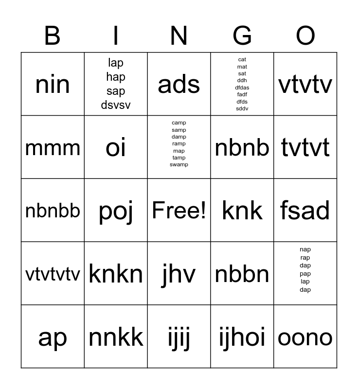 This bingo card has a free space and 29 words: ap, pojpopp, poj, pjpoo, nin, ads, oi, knkn, knk, nnkk, fsad, oono, ijij, ijhoi, tvtvt, tvtvh, jhv, vtvtvtv, vtvtv, nbnbb, nbbn, fcfc, nbnb, mmm, cat mat sat ddh dfdas fadf dfds sddv, lap hap sap dsvsv, nap rap dap pap lap dap, camp samp damp ramp map tamp swamp and cake sake wake dake nake abs abw.