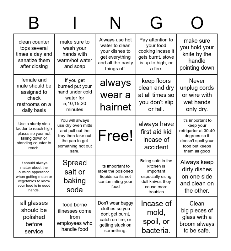This bingo card has a free space and 24 words: Spread salt or baking soda, food borne illnesses come from employees who handle food, always wear a hairnet, all glasses should be polished before service, make sure you hold your knife by the handle pointing down, clean counter tops several times a day and sanatize them after closing, female and male should be assigned to check restrooms on a daily basis, make sure to wash your hands with warm/hot water and soap, always have first aid kid incase of accident, Its important to label the posioned liquids so its not contaminting your food, keep floors clean and dry at all times so you don't slip or fall., Use a sturdy step ladder to reach high places so your not falling down or standing counter to reach., Being safe in the kitchen is important especially using dull knives they cause more troubles, Always keep dirty dishes on one side and clean on the other., If you get burned put your hand under cold water for 5,10,15,20 minutes, Incase of mold, spoil, or bacteria., It's important to keep your refrigartor at 30-40 degrees so it doesn't spoil your food but keeps them all good, Always use hot water to clean your dishes to get everything and all the nasty things off., Never unplug cords or wire with wet hands only dry., You will always use dry oven mitts and pull out the tray then take out the pan to get something hot out safe., Clean big pieces of glass with a broom always to be safe., It should always matter about the outside apperance when getting mean or vegetables to know your food is in good hands., Pay attention to your food cooking incase it gets burnt, stove is up to high, or a fire. and Don't wear baggy clothes so you dont get burnt, catch on fire, or getting stuck on something..
