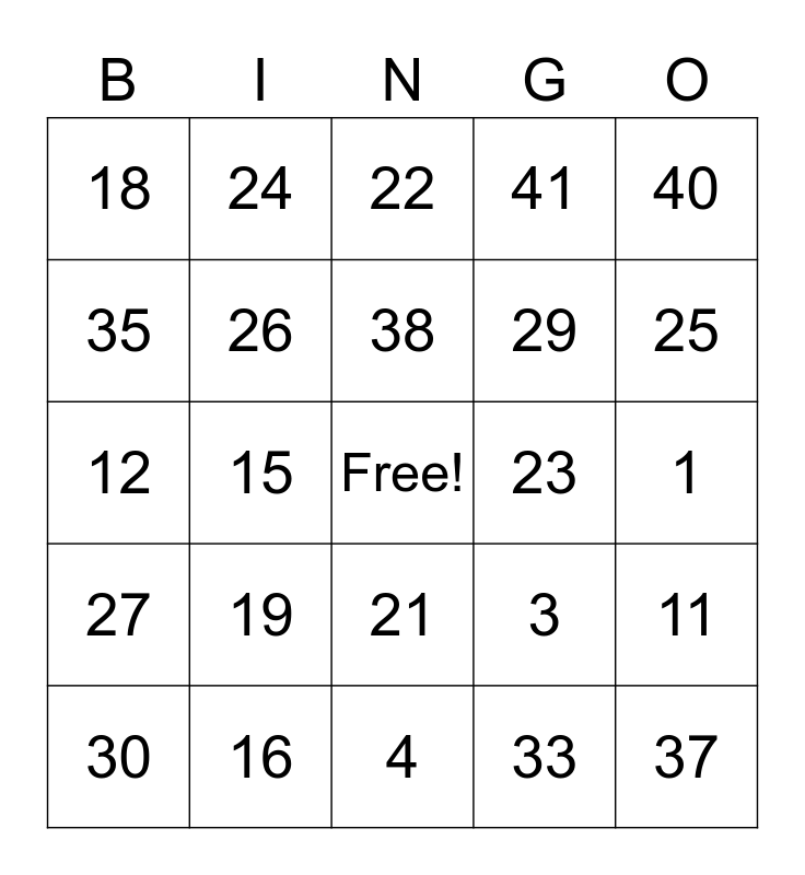 This bingo card has a free space and 42 words: 14, 38, 9, 19, 33, 11, 37, 6, 22, 21, 1, 25, 15, 40, 36, 3, 13, 12, 42, 24, 35, 34, 20, 18, 8, 10, 29, 17, 7, 31, 39, 27, 26, 4, 2, 30, 16, 23, 28, 32, 41 and 5.
