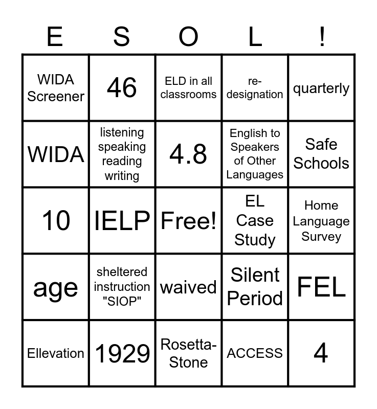 This bingo card has a free space and 24 words: sheltered instruction "SIOP", 1929, 4.8, Ellevation, quarterly, WIDA Screener, WIDA, 46, EL Case Study, waived, English to Speakers of Other Languages, 10, Silent Period, FEL, listening speaking reading writing, ACCESS, Home Language Survey, ELD in all classrooms, Safe Schools, IELP, 4, age, re-designation and Rosetta-Stone.