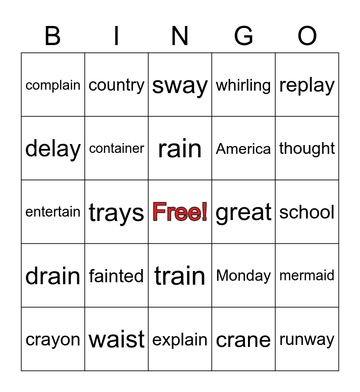 This bingo card has a free space and 24 words: fainted, waist, rain, crayon, replay, complain, delay, country, great, train, America, entertain, Monday, mermaid, container, crane, school, sway, thought, trays, runway, drain, whirling and explain.