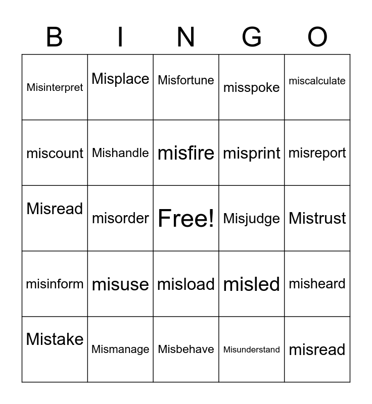 This bingo card has a free space and 24 words: Mistake, misuse, misfire, Misunderstand, miscalculate, Misinterpret, Misplace, Misfortune, Misjudge, Mistrust, Misread, Mishandle, misled, misheard, miscount, Mismanage, Misbehave, misspoke, misreport, misinform, misorder, misload, misprint and misread.