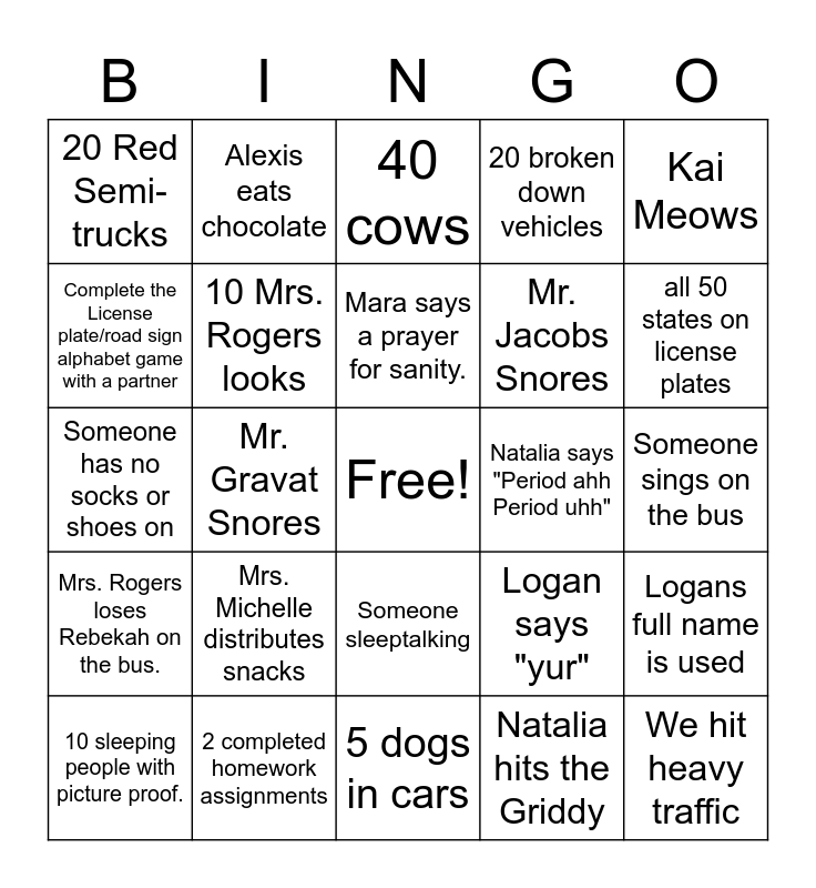 This bingo card has a free space and 38 words: 5 people use the bathroom, 3 Farts, Mrs. Rogers Says Enough, 10 Mrs. Rogers looks, Logans full name is used, Mrs. Michelle distributes snacks, Mara says a prayer for sanity., Kai and Nadia Mention Amongus, Kai Meows, Mr. Jacobs Snores, Mr. Gravat Snores, 20 broken down vehicles, We hit heavy traffic, Someone sings on the bus, Complete the License plate/road sign alphabet game with a partner, Mrs. Rogers loses Rebekah on the bus., Bella says " Can you not", 40 cows, 3 people ask are we there yet?, Natalia says "Period ahh Period uhh", 20 Red Semi-trucks, 2 completed homework assignments, all 50 states on license plates, 10 sleeping people with picture proof., 10 sports cars, 5 dogs in cars, 10 feet on dashboard, 5 vanity plates, billboard advertising "best something", Zoe says "bye", 2 funny billboard, Someone sleeptalking, Natalia hits the Griddy, Alexis eats chocolate, 3 dancing students, Logan says "yur", Someone has no socks or shoes on and Raj offers you snacks.