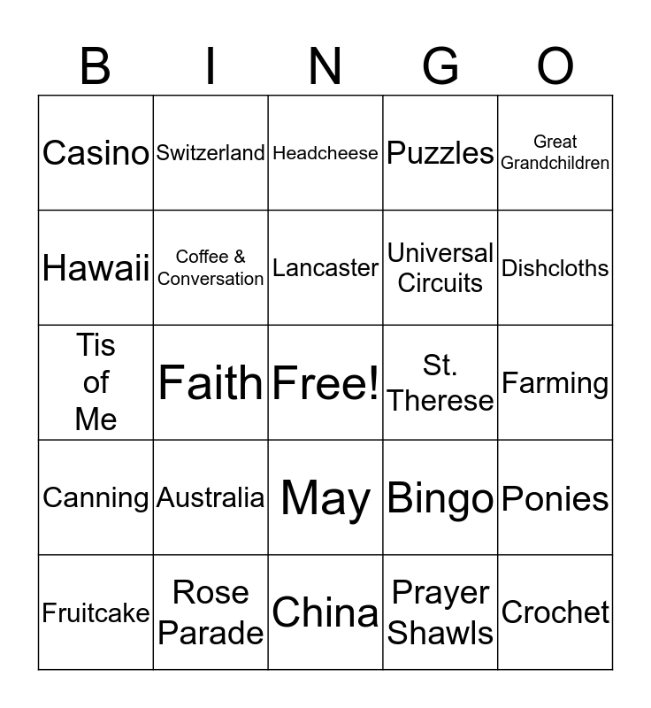 This bingo card has a free space and 51 words: Knitting, Crochet, Ireland, China, Australia, Paris, Switzerland, Germany, Hawaii, Disney, Coffee & Conversation, Puzzles, Ponies, Bingo, Beer & Pizza, Happiness Books, Lancaster, St. Therese, Grandchildren, Great Grandchildren, Faith, Prayer Shawls, Casino, Universal Circuits, Alaska, Washington, Dishcloths, Mug Rugs, Fruitcake, Headcheese, St. Patrick's Day, Refunders, Friendly Robins, Chuck, Marj & Larry, Rose Parade, Polka Music, Afghans, Victor, Angel, Farming, Canning, Apple Butter, Christmas Shopping, Garage Sales, Orange Bowl, Tis of Me, Granny, Donahe, May and 1925-2015.