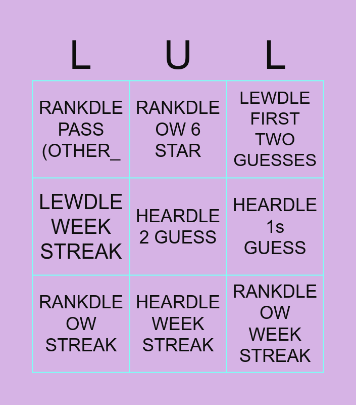 This bingo card has a free space and 8 words: HEARDLE 1s GUESS, LEWDLE FIRST TWO GUESSES, RANKDLE OW 6 STAR, RANKDLE OW STREAK, RANKDLE PASS (OTHER_, RANKDLE OW WEEK STREAK, LEWDLE WEEK STREAK and HEARDLE WEEK STREAK.