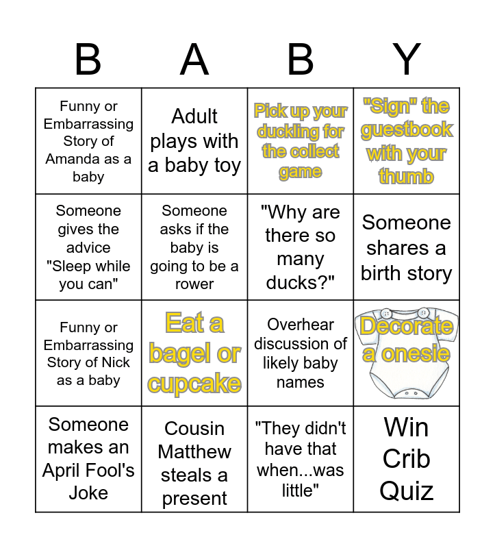 This bingo card has 1 images and 16 words: Cousin Matthew steals a present, Decorate a onesie, Pick up your duckling for the collect game, Funny or Embarrassing Story of Amanda as a baby, Funny or Embarrassing Story of Nick as a baby, Adult plays with a baby toy, Overhear discussion of likely baby names, "They didn't have that when...was little", Someone gives the advice "Sleep while you can", Someone asks if the baby is going to be a rower, Someone makes an April Fool's Joke, "Sign" the guestbook with your thumb, Eat a bagel or cupcake, Someone shares a birth story, "Why are there so many ducks?" and Win Crib Quiz.