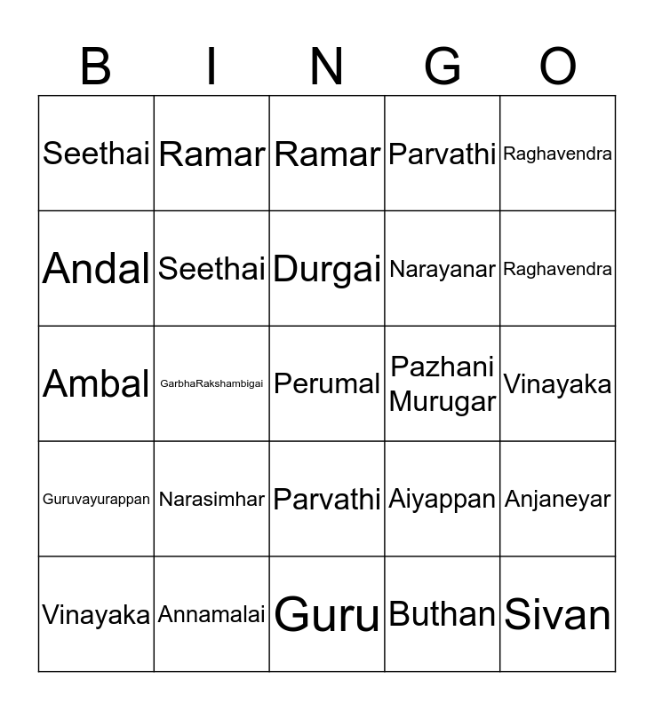 ⚠ This card has duplicate items: Murugan (2), Sivan (2), Vishnu (2), Brahman (2), Anjaneyar (2), Lakshmi (2), Ramar (2), Krishnar (2), Durgai (2), Saraswathi (2), Parvathi (2), Vinayaka (2), Raghavendra (2), Ambal (2), Andal (2), Seethai (2), Kali (2), Narasimhar (2), Narayanar (2), Aiyappan (2), Guruvayurappan (2)