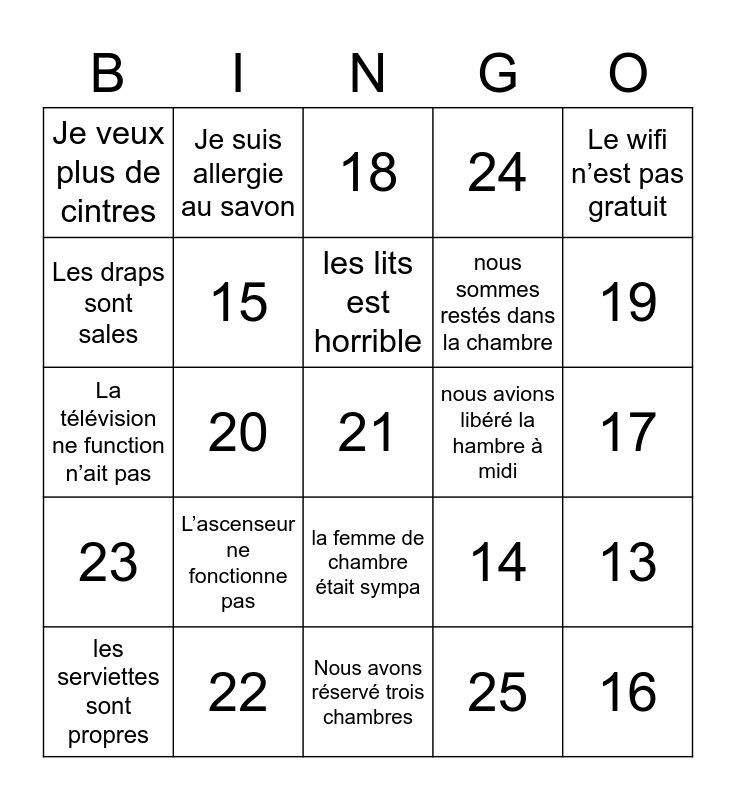 This bingo card has 25 words: L’ascenseur ne fonctionne pas, Nous avons réservé trois chambres, les lits est horrible, les serviettes sont propres, Le wifi n’est pas gratuit, Je veux plus de cintres, Les draps sont sales, Je suis allergie au savon, nous avions libéré la hambre à midi, la femme de chambre était sympa, nous sommes restés dans la chambre, La télévision ne function n’ait pas, 14, 13, 15, 16, 17, 18, 19, 20, 21, 22, 23, 24 and 25.