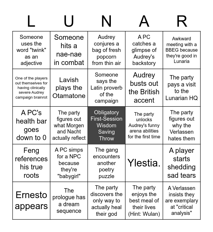This bingo card has a free space and 24 words: A PC simps for a NPC because they're "babygirl", The prologue has a dream sequence, Someone says the Latin proverb of the campaign, Ernesto appears, Awkward meeting with a BBEG because they're good in Lunaria, Someone uses the word "twink" as an adjective, One of the players out themselves for having clinically severe Audrey campaign brainrot, Someone hits a nae-nae in combat, The party unlocks Audrey's funny arena abilities for the first time, The gang encounters another poetry puzzle, Audrey busts out the British accent, A PC's health bar goes down to 0, Ylestia., A player starts shedding sad tears, Lavish plays the Otamatone, The party enjoys the best meal of their lives (Hint: Wulan), The party figures out why the Verlassen hates them, Audrey conjures a bag of fresh popcorn from thin air, The party pays a visit to the Lunarian HQ, The party figures out what Morgen and Nacht actually reflect, A Verlassen insists they are exemplary at "critical analysis", Feng references his true roots, A PC catches a glimpse of Audrey's backstory and The party discovers the only way to actually heal their god.