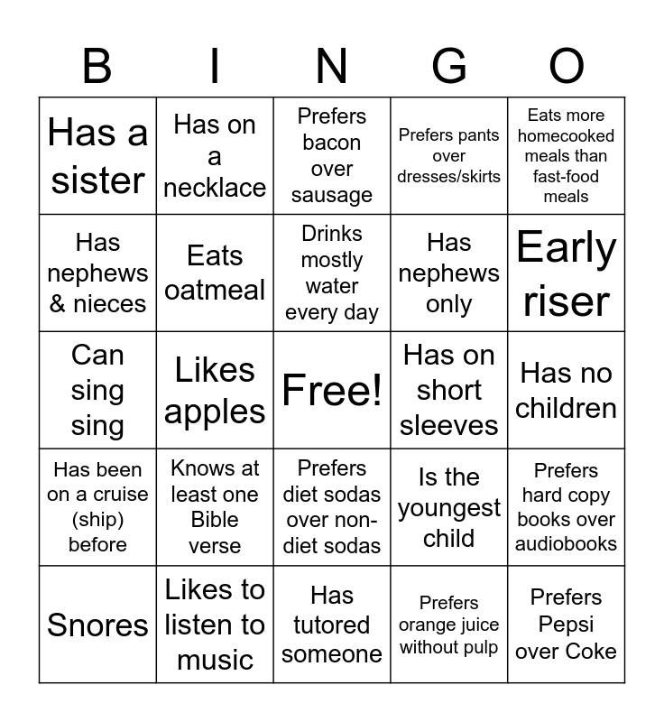 This bingo card has a free space and 32 words: Prefers orange juice without pulp, Eats yogurt, Likes apples, Afraid of frogs, Has been on a cruise (ship) before, Eats oatmeal, Eats more homecooked meals than fast-food meals, Prefers hard copy books over audiobooks, Has on a necklace, Prefers fried as opposed to baked, Drinks mostly water every day, Prefers bacon over sausage, Prefers to text over calling, Has a social media account, Has on short sleeves, Prefer pancakes over waffles, Snores, Can sing sing, Prefers diet sodas over non-diet sodas, Knows at least one Bible verse, Is the youngest child, Has ridden on a motorcycle, Has no children, Likes to listen to music, Prefers Pepsi over Coke, Prefers pants over dresses/skirts, Has nephews only, Has nephews & nieces, Has a sister, Has tutored someone, Prefers Summer over Winter and Early riser.