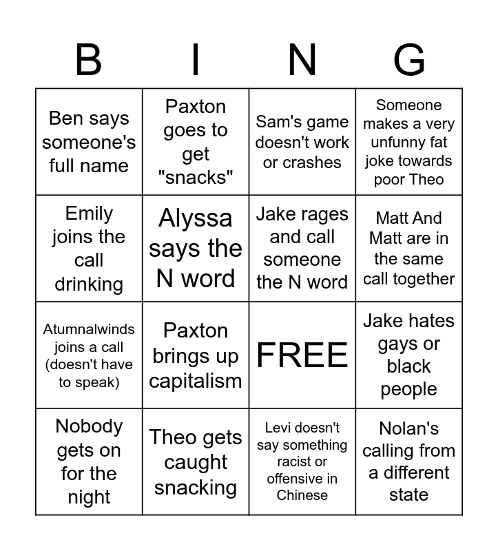 This bingo card has 16 words: Theo gets caught snacking, Jake hates gays or black people, Sam's game doesn't work or crashes, Ben says someone's full name, Atumnalwinds joins a call (doesn't have to speak), Paxton goes to get "snacks", FREE, Levi doesn't say something racist or offensive in Chinese, Emily joins the call drinking, Alyssa says the N word, Nobody gets on for the night, Someone makes a very unfunny fat joke towards poor Theo, Paxton brings up capitalism, Matt And Matt are in the same call together, Jake rages and call someone the N word and Nolan's calling from a different state.