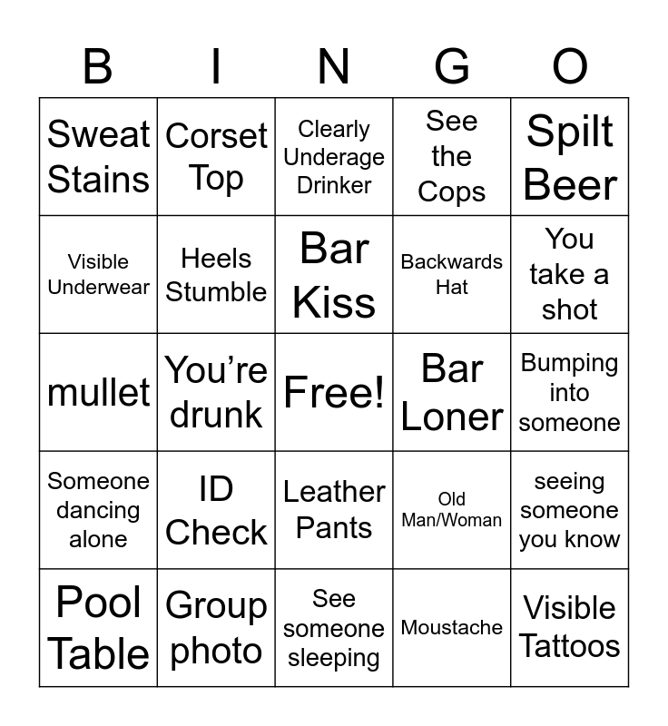 This bingo card has a free space and 24 words: ID Check, Group photo, Bar Kiss, Pool Table, Spilt Beer, Sweat Stains, Visible Underwear, Corset Top, Bar Loner, Leather Pants, Backwards Hat, mullet, Old Man/Woman, seeing someone you know, Heels Stumble, Moustache, Bumping into someone, Clearly Underage Drinker, You take a shot, You’re drunk, Visible Tattoos, Someone dancing alone, See the Cops and See someone sleeping.