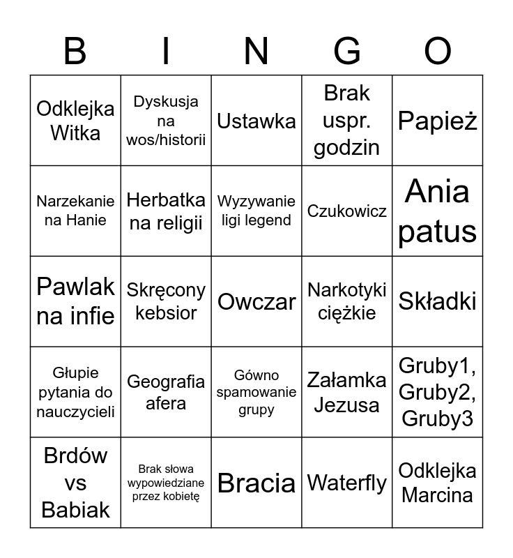 This bingo card has a free space and 24 words: Geografia afera, Brak słowa wypowiedziane przez kobietę, Wyzywanie ligi legend, Brdów vs Babiak, Papież, Odklejka Witka, Narzekanie na Hanie, Dyskusja na wos/historii, Narkotyki ciężkie, Gówno spamowanie grupy, Czukowicz, Pawlak na infie, Załamka Jezusa, Gruby1, Gruby2, Gruby3, Herbatka na religii, Waterfly, Składki, Ustawka, Ania patus, Skręcony kebsior, Odklejka Marcina, Głupie pytania do nauczycieli, Brak uspr. godzin and Bracia.