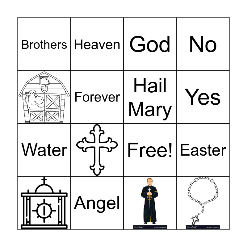 This bingo card has 6 images and 16 words: Angel, Heaven, Everything, Forever, Hail Mary, Brothers, God, Free!, Water, No, Kill Boys under 2, Wine, Body and Blood of Christ, Easter, Yes and Blessed Trinity.