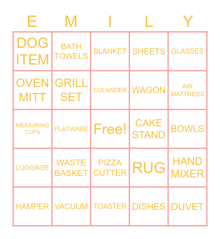 This bingo card has a free space and 29 words: HAMPER, GRILL, FLATWARE, FLOOR CLEANER, DOG ITEM, BLANKET, GRILL SET, WASTE BASKET, CAKE STAND, VACUUM, BOWLS, DUVET, TOASTER, DISHES, AIR MATTRESS, RAKE, PIZZA CUTTER, LUGGAGE, GLASSES, MEASURING CUPS, RUG, PILLOWS, WAGON, OVEN MITT, SHEETS, BATH TOWELS, HAND MIXER, COLANDER and KITCHEN TOWELS.