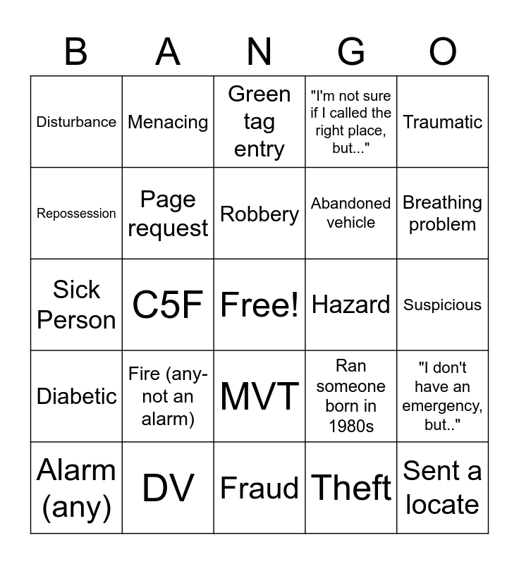 This bingo card has a free space and 29 words: Alarm (any), C5M, C5F, TA, Disturbance, Green tag entry, Page request, Fire (any-not an alarm), Hazard, DV, Suspicious, Sent a locate, Fraud, Theft, Breathing problem, Unconscious, MVT, Diabetic, Traumatic, Sick Person, Ran someone born in 1980s, Parking complaint, Abandoned vehicle, Repossession, "I'm not sure if I called the right place, but...", Menacing, "I don't have an emergency, but..", Robbery and Private tow.