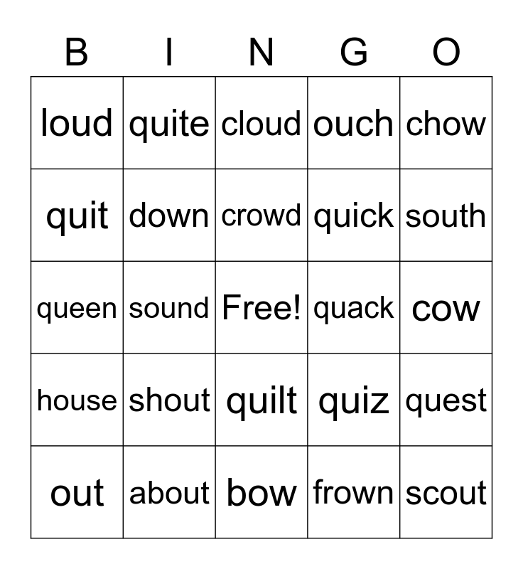 This bingo card has a free space and 24 words: shout, about, crowd, out, chow, loud, quit, quite, quack, quilt, quick, queen, quiz, quest, down, frown, cow, cloud, south, sound, scout, house, ouch and bow.