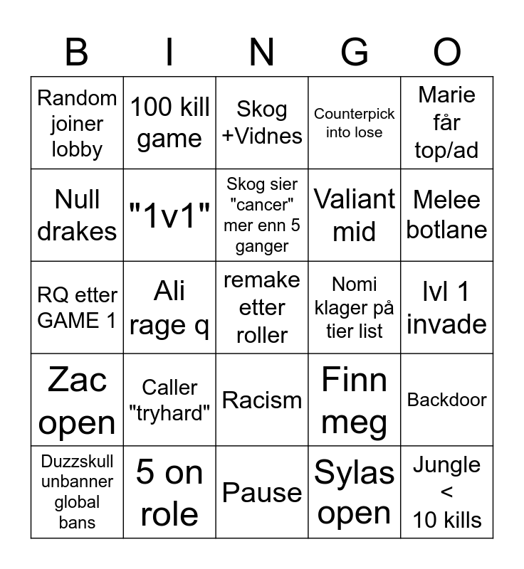 This bingo card has a free space and 24 words: Caller "tryhard", 5 on role, Skog sier "cancer" mer enn 5 ganger, Duzzskull unbanner global bans, Marie får top/ad, Random joiner lobby, Null drakes, 100 kill game, Nomi klager på tier list, Racism, Valiant mid, RQ etter GAME 1, Finn meg, Backdoor, "1v1", Sylas open, lvl 1 invade, Skog +Vidnes, Melee botlane, Ali rage q, Jungle < 10 kills, Zac open, Counterpick into lose and Pause.